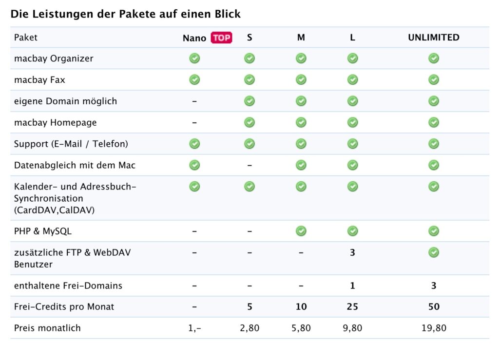 In allen Tarifen entfallen sind Fax, SMS & die Macbay-Homepages. Hierfür wird es voraussichtlich noch Ersatz geben.